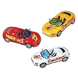 This is for a Three Pack of Friction Toy Cars. Comes in 3 different colors. Each measures 8" Long. Has nice decals stickers on them. These are tons of fun for kids and even adults enjoy playing with them. Great gift for child especially one who likes cars. Note: A recommended age of 5+ for